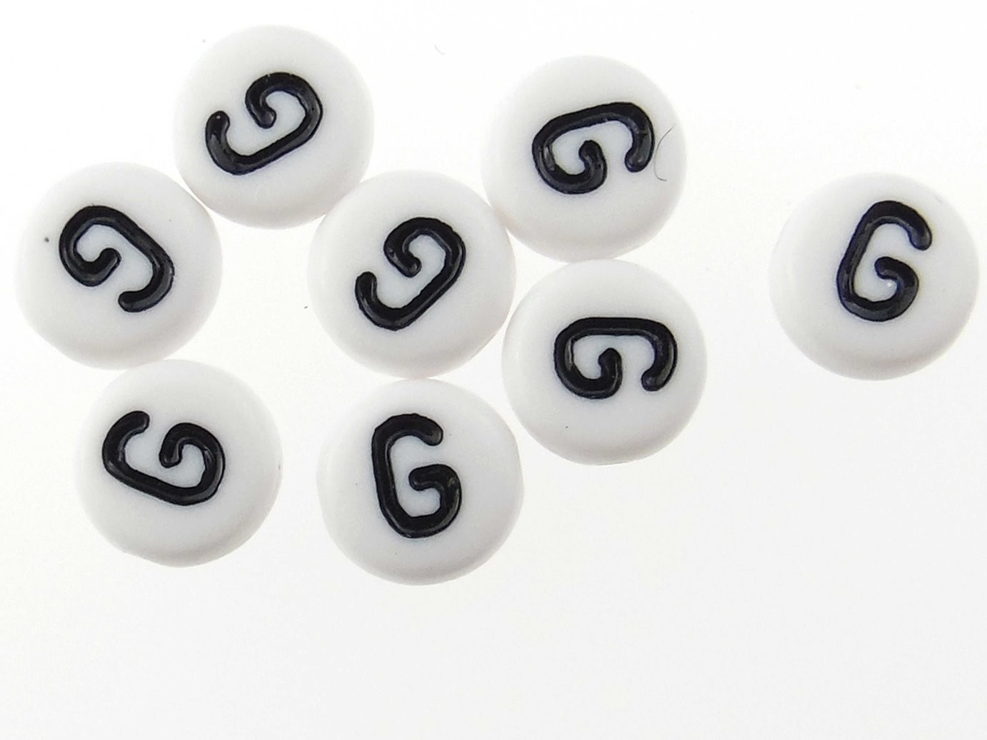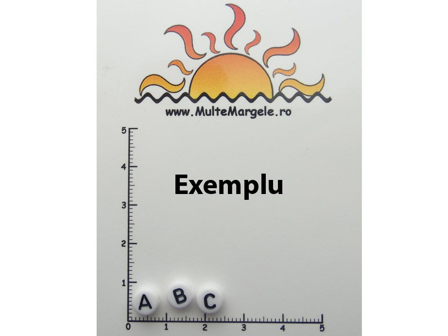 Margele din acril cu litere. Diametru: 7mm. Grosime: 4mm. Orificiu: ~0.8mm. Pretul se refera la 5 bucati.