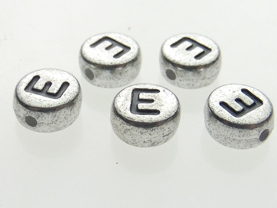 Margele argintii din acril cu litere. Diametru: 7mm. Grosime: 4mm. Orificiu: ~0.8mm. Pretul se refera la 5 bucati.