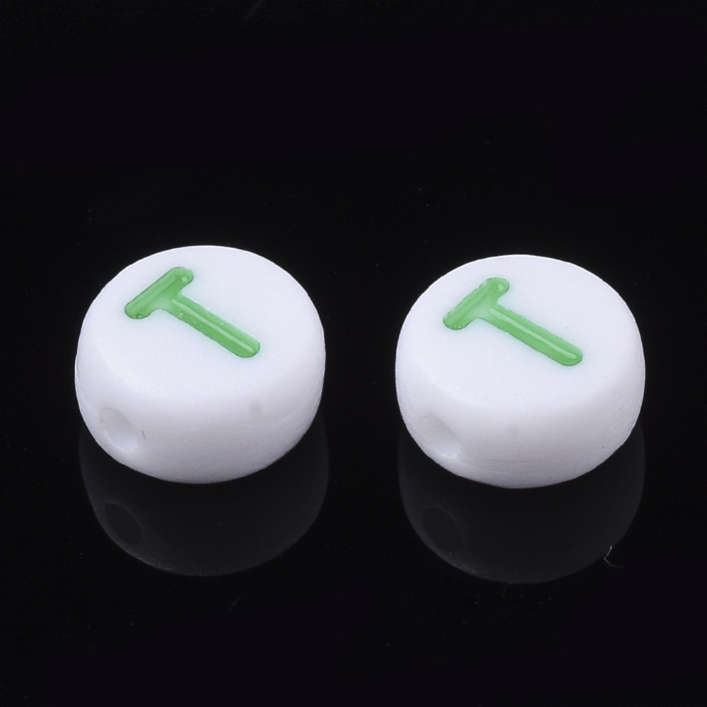 Margele multicolor din acril cu litere. Diametru: 7mm. Grosime: 4mm. Orificiu: ~1.2mm. Pretul se refera la 5 bucati.