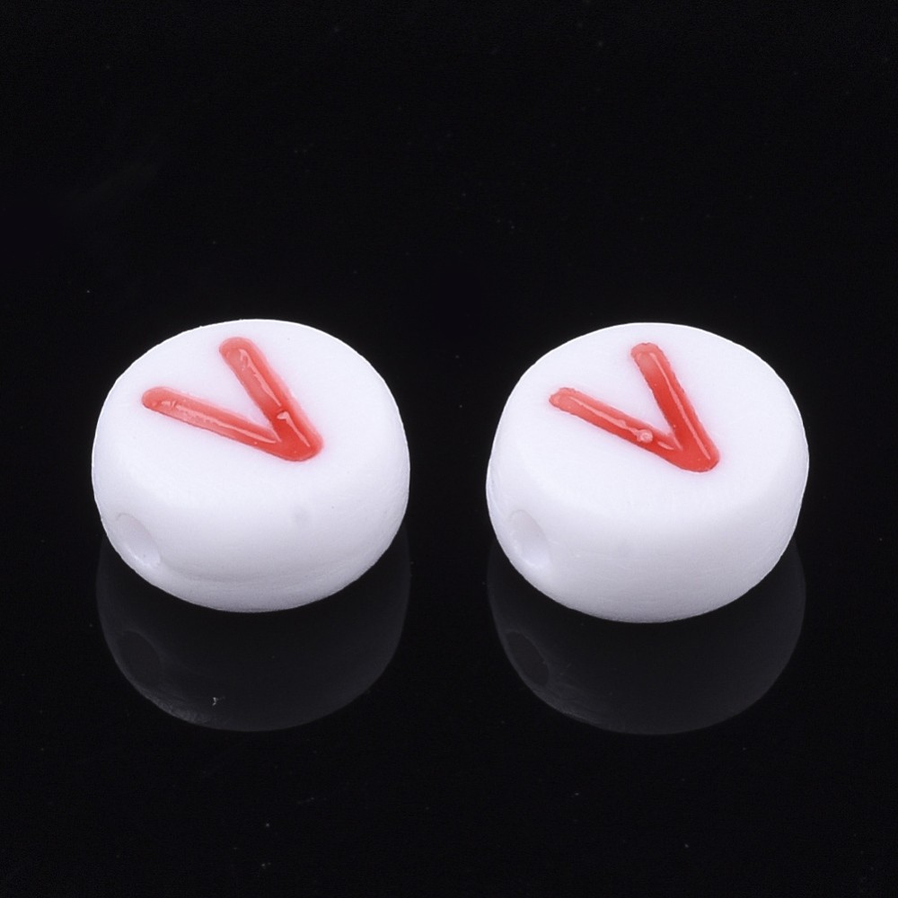 Margele multicolor din acril cu litere. Diametru: 7mm. Grosime: 4mm. Orificiu: ~1.2mm. Pretul se refera la 5 bucati.