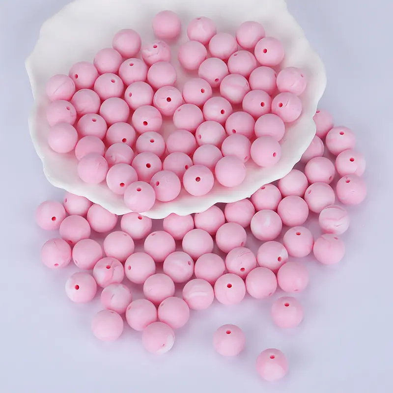 Această mărgea rotundă din silicon sintetic, în nuanța roz marmorat, este un accesoriu decorativ ideal pentru bijuterii handmade și proiecte creative. Culoarea roz este combinată cu accente albe sau deschise. Aspectul marmorat oferă fiecărei mărgele un model unic. Acest efect creează o notă elegantă și modernă în orice accesoriu.